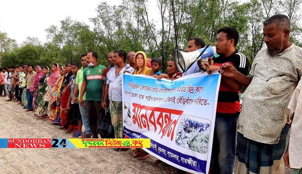 গতকাল মঙ্গলবার বিকাল ৪টায় দুরমুজখালী-দক্ষিণ কুলতলী এলাকার সাধারন মানুষের আয়োজনে সীমান্তের কালিন্দী নদীর পাউবোর বেড়ীবাধে যত্রতত্র ছিদ্র করে অবৈধ পাইপ দিয়ে মৎস্য ঘেরে লোনা পানি উত্তোলন বন্ধের জন্য মানববন্ধনে এলাকার শতশত নারী পুরুষ অংশ গ্রহন করেন। মানববন্ধনে বক্তারা বলেন কালিগঞ্জ পানি উন্নয়ন বোর্ডের কর্মকর্তার বেসুমার ঘুষ বানিজ্যের কারনে অবৈধ ঘোষনার পরও বহাল তবিয়তে বেঁড়ীবাধে যত্রতত্র ছিদ্র করে অবৈধ পাইপ দিয়ে মৎস্য ঘেরে লোনা পানি উত্তোলন চলমান আছে। যার ফলে কয়েক দিন আগের প্রলয়ঙ্ককারী ঘুর্ণিঝড় ইয়াসের প্রভাবে জোয়ারে কালিন্দী নদীর পানি বৃদ্ধিতে পাইপ স্থাপনের স্থান ভাঙ্গণ কবলিত হয়। এতে প্লাবিত হয়ে ক্ষতিগ্রস্থ হয়েছে বিস্তীর্ন এলাকা।