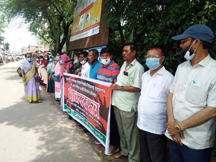 হাফিজুর রহমান শিমুলঃ কালিগঞ্জ উপজেলায় নোয়াখালীর বেগমগঞ্জে গৃহবধূকে বিবস্ত্র করে নির্যাতনসহ সারাদেশে ধর্ষণ, যৌন নিপীড়ন ও নারী নির্যাতনের প্রতিবাদে মানববন্ধন অনুষ্ঠিত হয়েছে। মঙ্গলবার (৬ অক্টোবর) বেলা ১১ টায় উপজেলা পরিষদের সামনে ঘণ্টাব্যাপী এ মানববন্ধন কর্মসূচী পালন করে নারী উন্নয়ন সংগঠন প্রেরণা। প্রেরণা'র আয়োজনে মানববন্ধন কর্মসূচিতে সভাপতিত্ব করেন উপজেলা লেডিস ক্লাবের সাধারণ সম্পাদিকা নারীনেত্রী ইলা দেবী মল্লিক। প্রেরণা নারী কর্মী শামিমার সঞ্চালনায় অনুষ্ঠানে স্বাগত বক্তব্য রাখেন প্রেরণা এর নির্বাহী পরিচালক সম্পা গোস্বামী। মানববন্ধন কর্মসূচিতে বক্তব্য রাখেন দৈনিক প্রথম আলো পত্রিকার সাতক্ষীরা স্টাফ রিপোর্টার কল্যাণ ব্যানার্জি, সময় চ্যানেলের জেলা প্রতিনিধি মমতাজ আহমেদ বাপ্পি, কালিগঞ্জ উপজেলা মহিলা ভাইস চেয়ারম্যান দিপালী রানী ঘোষ, সাংবাদিক সমিতি কালিগঞ্জ উপজেলা শাখার সভাপতি শেখ আনোয়ার হোসেন, কালিগঞ্জ প্রেসক্লাবের সাধারণ সম্পাদক সুকুমার দাস বাচ্চু, দৈনিক দৃষ্টিপাত কালিগঞ্জ ব্যুরো প্রধান আশিক মেহেদী, মিশন মহিলা সংস্থার পরিচালক শেখ আব্দুল্লাহ, মানববন্ধন কর্মসূচিতে এনজিও প্রতিনিধি, নারীনেত্রী, সাংবাদিক, সাংস্কৃতিক কর্মী ও সমাজকর্মী সহ প্রেরণা নারী কর্মীরা উপস্থিত ছিলেন। বক্তারা বেগমগঞ্জের নারী নির্যাতনসহ সারাদেশের সকল প্রকার নারী নির্যাতন যৌন হয়রানি ধর্ষণ সহ সকল প্রকার অপরাধ নির্মূলে সরকারের হস্তক্ষেপ কামনা করেন এবং অপরাধীদের দ্রুত বিচারের আওতায় আনার দাবি জানান।