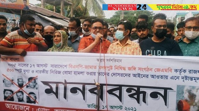 মঙ্গলবার(১৭ আগস্ট) বিকাল ৫ টায় শ্যামনগর উপজেলা আওয়ামীলীগের আয়োজনে সদর বাসস্টান্ডে এক বিশাল মানববন্ধন অনুষ্ঠিত হয়। সাতক্ষীরা নারী শিশু নির্যাতন দমন ট্রাইব্যুনালের পিপি ও শ্যামনগর সদর ইউপি চেয়ারম্যান উপজেলা আওয়ামী লীগের সহ সভাপতি এ্যাডঃ এস,এম জহুরুল হায়দার বাবু’র সভাপতিত্বে বক্তব্য রাখেন উপজেলা আওয়ামী লীগের সহ-সভাপতি অধ্যক্ষ জুলফিকার আল মেহদি লিটন, যুগ্ম সাধারণ সম্পাদক প্রভাষক মোশাররফ হোসেন, সাংগঠনিক সম্পাদক সুশান্ত বিশ্বাস বাবুলাল, নূরনগর ইউনিয়ন আওয়ামী লীগের সাধারণ সম্পাদক সোহেল রানা বাবু সহ অঙ্গ সহযোগী সংগঠনের বিভিন্ন পর্যায়ের নেতৃবৃন্দ। এ সময় বক্তরা সারাদেশে সিরিজ বোমা হামলার সাথে যারা জড়িত তাদের বিরুদ্ধে দৃষ্টান্তমুলক শাস্তির দাবি জানান।