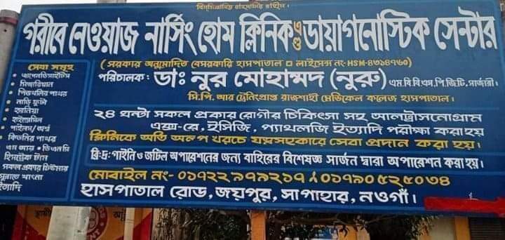 একটি নির্ভরযোগ্য সূত্র অনুযায়ী জানা গেছে, উপজেলা সদরের হাসপাতাল রোডে অবস্থিত গরীবে নেওয়াজ নার্সিং হোম কিèনিক এন্ড ডায়াগনোষ্টিক সেন্টার। এই ক্লিনিকের মালিক ডাঃ নুর মোহাম্মদ নুরু। দীর্ঘদিন আগে তিনি সাপাহারে এসে গার্লস স্কুল সংলগ্ন একটি বিল্ডিংয়ে তার ক্লিনিক ব্যাবসা চালু করেন। পরবর্তী সময়ে নিজের আচার আচরণের জন্য স্থানীয় লোকজনের চোখে একজন অপছন্দনীয় ব্যক্তি হিসেবে নিজেকে আত্মপ্রকাশ করেন। সেসময় থেকে তার নানারকম অনিয়মের অভিযোগ তোলেন স্থানীয় লোকজন সহ ভুক্তভুগীরা। আজো পর্যন্ত সে ডাক্তার কোথা থেকে এসেছে , তার বাড়ী কোথায় সে নিয়ে নানা প্রশ্ন জনমনে রয়েই গেছে। ওই সময় স্থানীয় দুইজন ভালো মাপের সাংবাদিক তার অনিয়মের সংবাদ সংগ্রহের জন্য গেলে তাদেরকে ফাঁসিয়ে থানায় একটি চাঁদাবাজী মামলা দায়ের করে ওই ডাক্তার । পরে তিনি চাঁদাবাজি প্রমান না করতে পয়ে থানায় অপমানিত হন। তার ক্লিনিকে গ্রাম থেকে গরীব অসহায় মেয়েদের নিয়ে এসে নার্স বলে চালিয়ে নিতেন ডাক্তার নূরু। কিন্তু সে মেয়েগুলো কেউ কেউ স্কুলের বারান্দা পর্যন্ত মাড়ায়নি বলে জানান একটি গোপন সূত্র। যত্র তত্র ভাবে নিজেই অ্যানেসথেসিয়া দিয়ে কোন রকম অপারেশন শেষ করে ডাক্তার নুরু। তার পর প্রশিক্ষণ প্রাপ্ত কোন নার্স ছাড়াই অশিক্ষিত , অর্ধ শিক্ষিত মেয়েদের দিয়ে সেবা চলতো ক্লিনিকের রোগীদের। যেখানে একজন স্বীকৃত অ্যানেসথেসিয়া ডাক্তার দিয়ে অজ্ঞান ম্যানেজ করার কথা সেখানে নুরু কোন শক্তিতে একাই রোগীদের জীবন নিয়ে খেলা করছেন এমনটাই প্রশ্ন ঘুরপাক খাচ্ছে জনমনে।