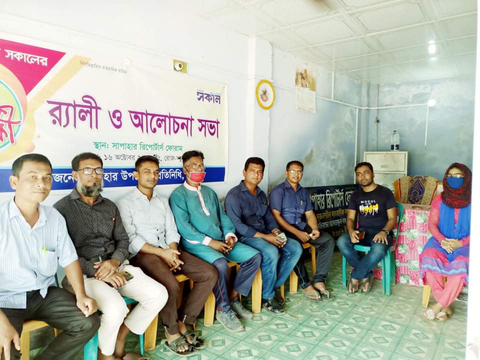 শুক্রবার সকাল ১০ টার দিকে সাপাহার রিপোর্টার্স ফোরাম হতে একটি বর্ণাঢ্য র্যালী বের হয়ে সদরের প্রধান সড়কগুলো প্রদক্ষিণ শেষে রিপোর্টার্স ফোরাম কার্যালয়ে দৈনিক আলোকিত সকাল পত্রিকার সাপাহার উপজেলা প্রতিনিধি হাফিজুল হকের সভাপতিত্বে এক আলোচনা সভা অনুষ্ঠিত হয়। এতে প্রধান অতিথি হিসেবে উপস্থিত ছিলেন সাবেক বিজিবি সদস্য আবুল হোসেন।