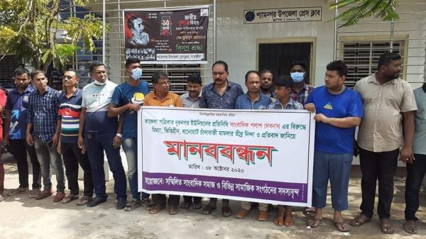 শ্যামনগর,প্রতিনিধি।। সাতক্ষীরা শ্যামনগর উপজেলা রিপোর্টার্স ক্লাবের সহ-সভাপতি ও দৈনিক কাফেলা পত্রিকার নুরনগর ইউনিয়ন প্রতিনিধি পলাশ দেবনাথকে মিথ্যা চাঁদাবাজি মামলায় গ্রেফতারের বিরুদ্ধে তীব্র নিন্দা এবং নিঃশর্ত মুক্তির দাবীতে মানববন্ধন ও বিক্ষোভ