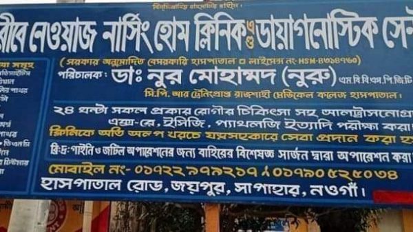 আবু বক্কার,সাপাহার নওগাঁ) প্রতিনিধি: নওগাঁর সাপাহারে অবস্থিত গরীবে নেওয়াজ নার্সিং হোম, ক্লিনিক এন্ড ডায়াগনোষ্টিক সেন্টারের বিরুদ্ধে নানাবধি অনিয়মের অভিযোগ উঠেছে। একটি নির্ভরযোগ্য সূত্র অনুযায়ী জানা গেছে, উপজেলা সদরের হাসপাতাল রোডে