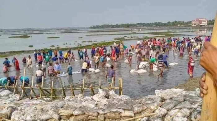 সাতক্ষীরা শ্যামনগরের খোলপেটুয়া নদীর ভেঙে যাওয়া বেড়িবাঁধটি অবশেষে স্থানীয় হাজার হাজার মানুষ স্বেচ্ছাশ্রমে রিংবাধ দিয়ে পানি বন্ধ করতে সক্ষম হয়েছে। শনিবার দুপুরে স্থানীয় ইউপি চেয়ারম্যান ভবতোষ মন্ডলের নেতৃত্বে শুক্রবার সকাল