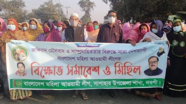 আবু বক্কার, সাপাহার (নওগাঁ) প্রতিনিধিঃ নওগাঁর সাপাহারে উপজেলা মহিলা আ’লীগের বিক্ষোভ মিছিল ও সমাবেশ অনুষ্ঠিত হয়েছে। জঙ্গিবাদ মৌলবাদ ও সাম্প্রদায়িকতার বিরুদ্ধে সারা দেশব্যাপী বাংলাদেশ মহিলা আওয়ামীলীগের কেন্দ্রীয় কর্মসূচীর অংশ হিসেবে